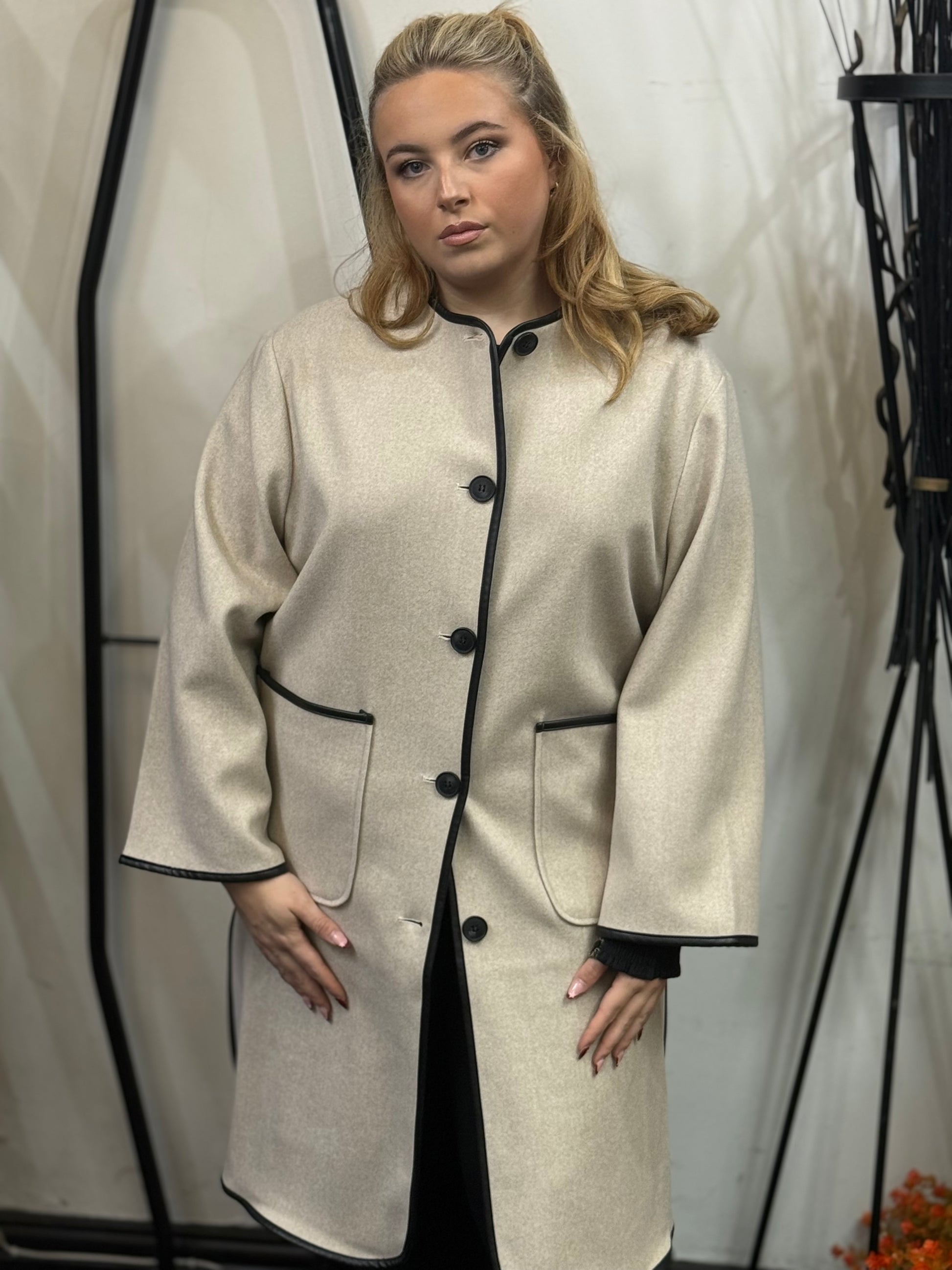 MELTON WOOL LOOK COAT. EDGE IN A BLACK VEGAN LEATHER TRIM