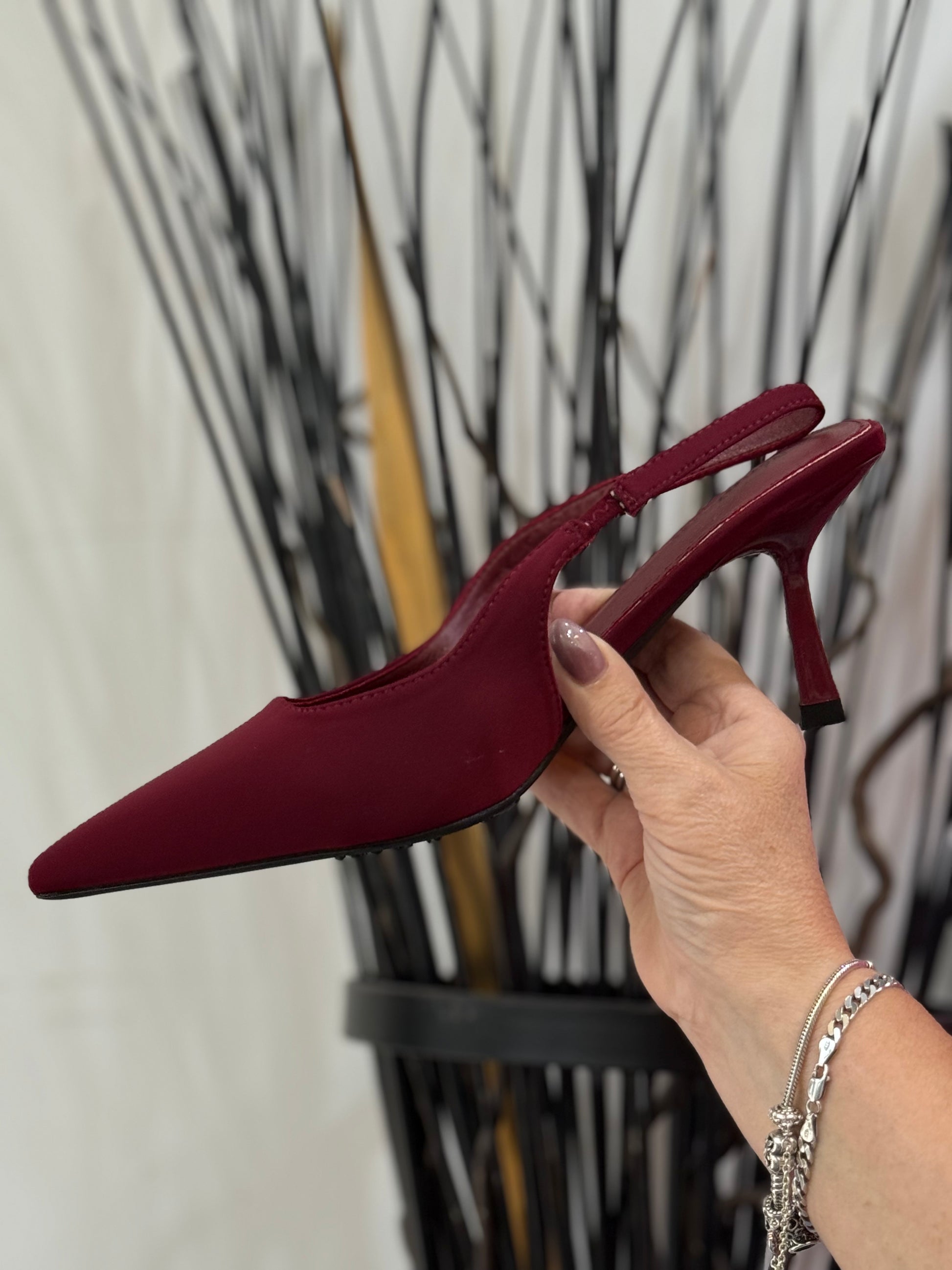 Synthetic comfortable sling back shoe with a 3" inch glossy matching heel. True to size.