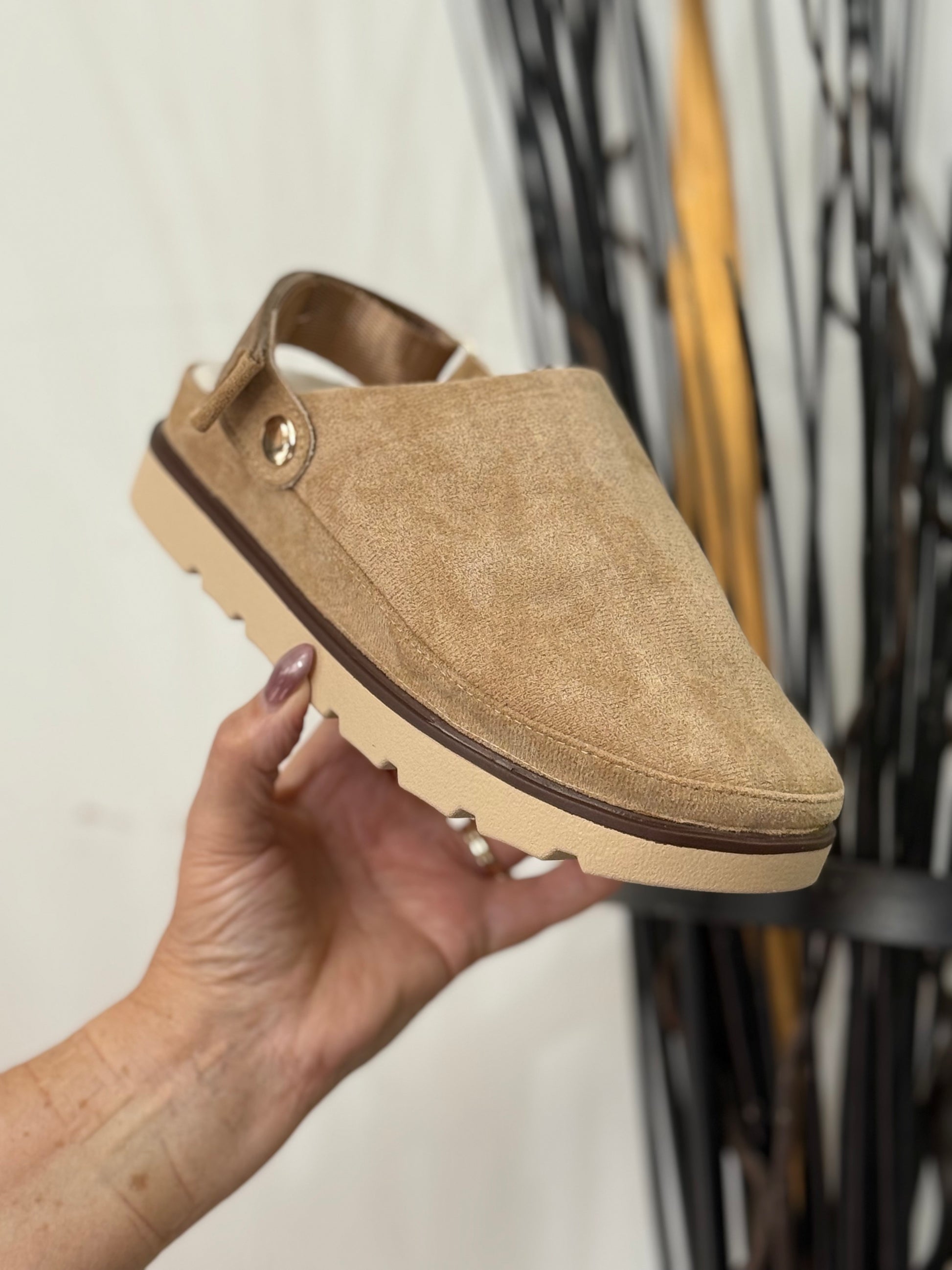 Sling back clugg with an adjustable back strap in a suede fabric and nice chunky sole .These have a lovely faux fur lining Great autumn winter look
