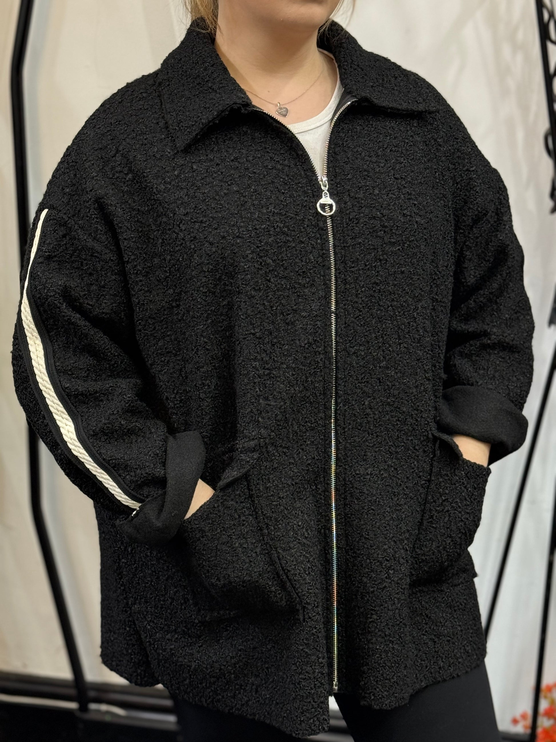 MEGAN-STRIPE SLEEVE TEDDY ZIP JACKET-CURVE