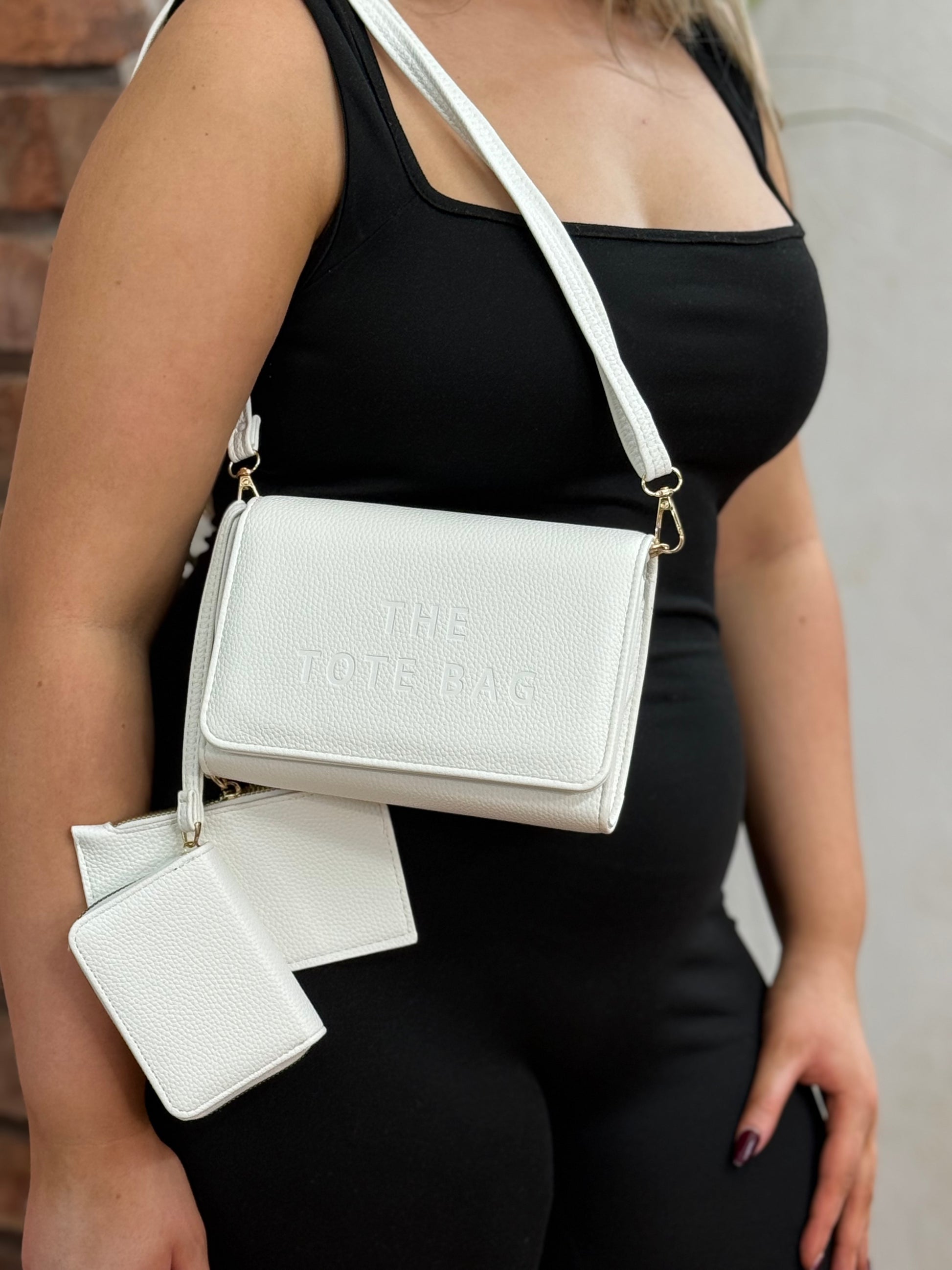 VEGAN LEATHER, EMBOSSED WITH 'THE TOTE BAG' . COMES WITH 2 MATCHING PURSES.