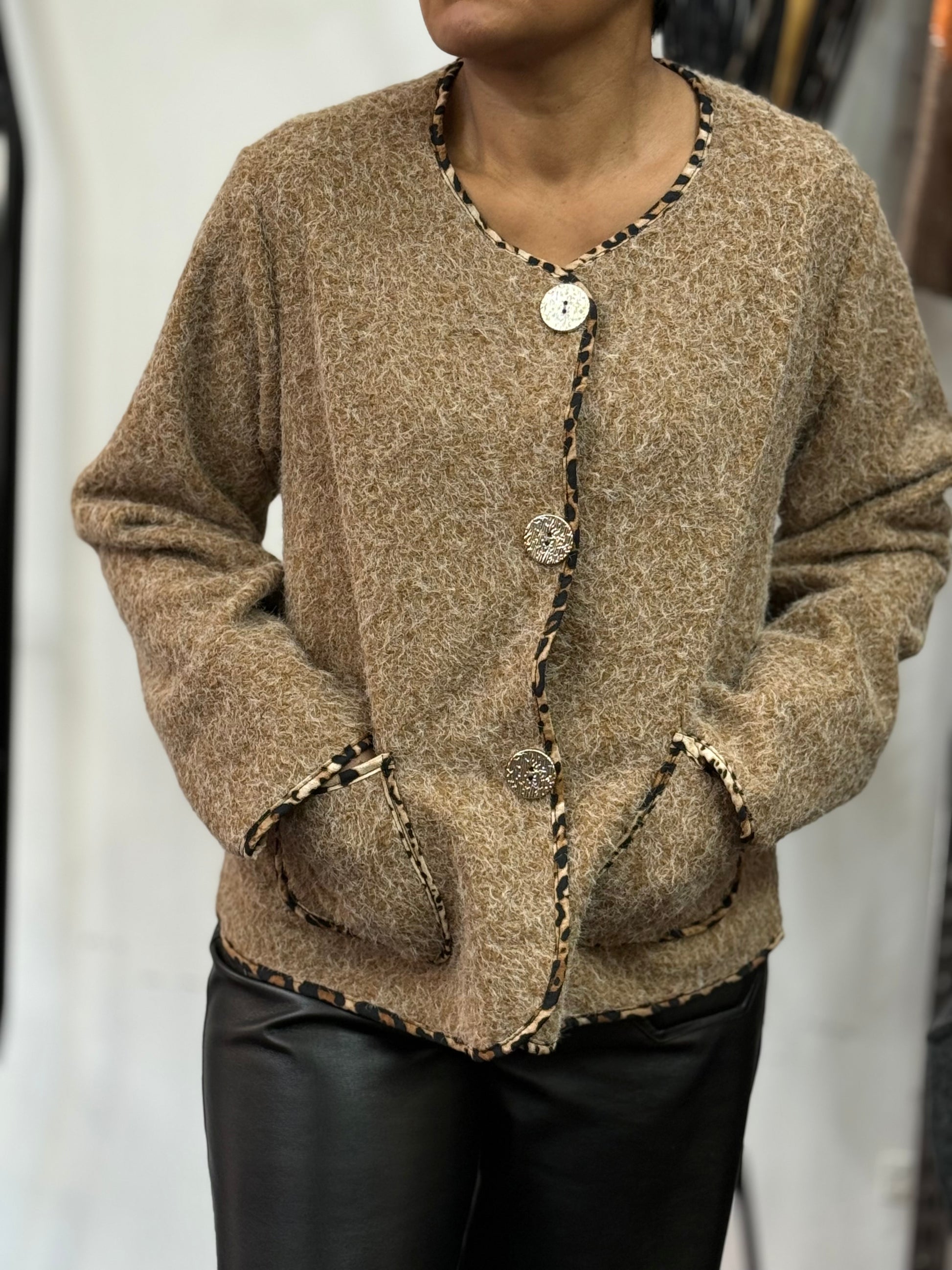 Upgrade your wardrobe with this stylish jacket top finished with a bold animal print trim for a touch of wild chic flair.