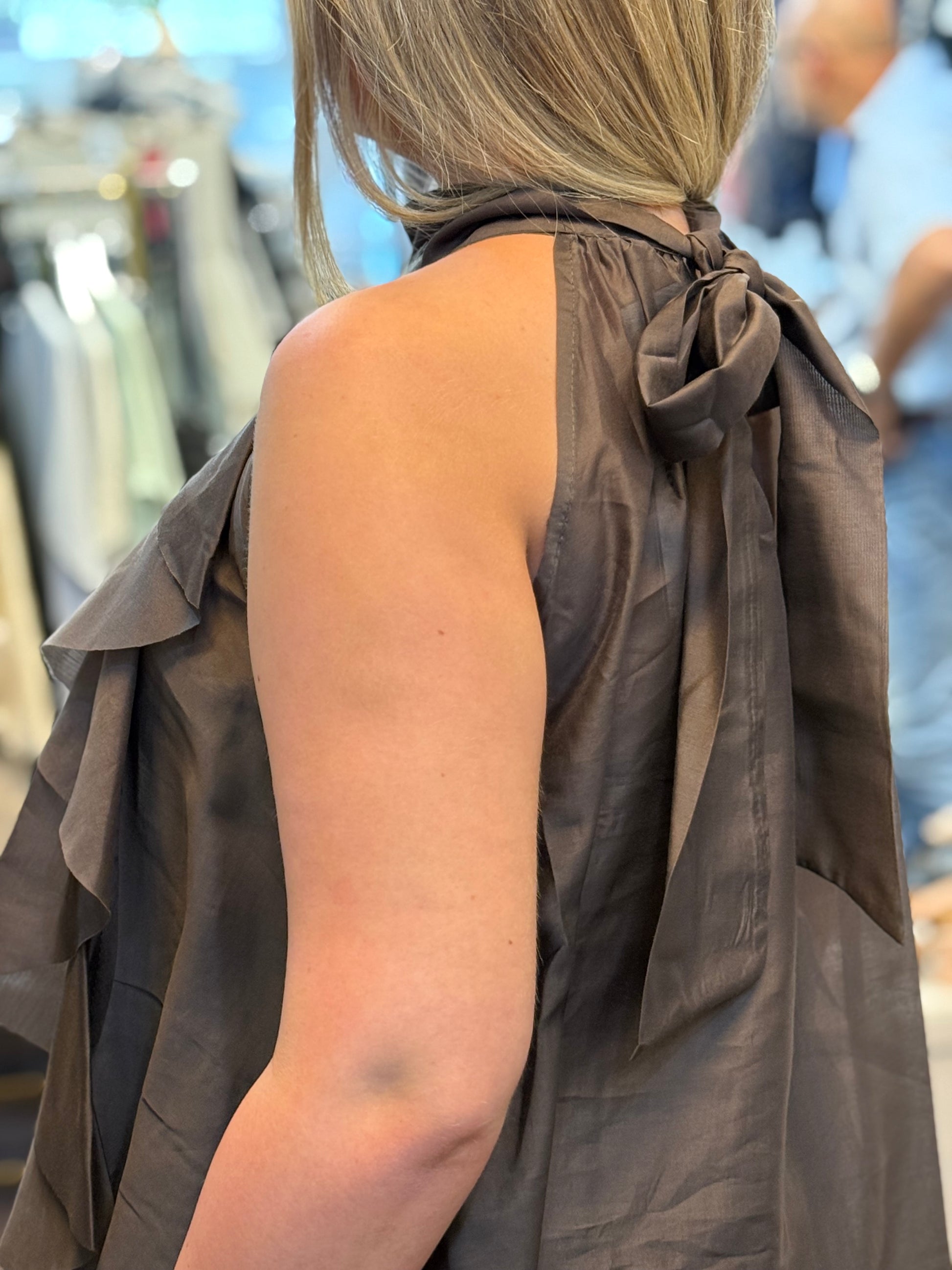 ONE SIZE, FITTING 8-16/18 . TIE BACK FRILL RUFFLE FRONT TOP. CUTAWAY STYLE.